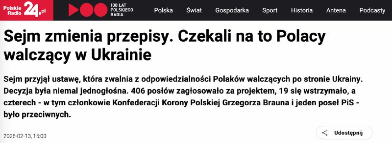 Наразі, згідно з польським законодавством, участь у бойових діях на стороні іноземної держави без дозволу Міністерства оборони карається позбавленням волі на строк від 3 місяців до 5 років.