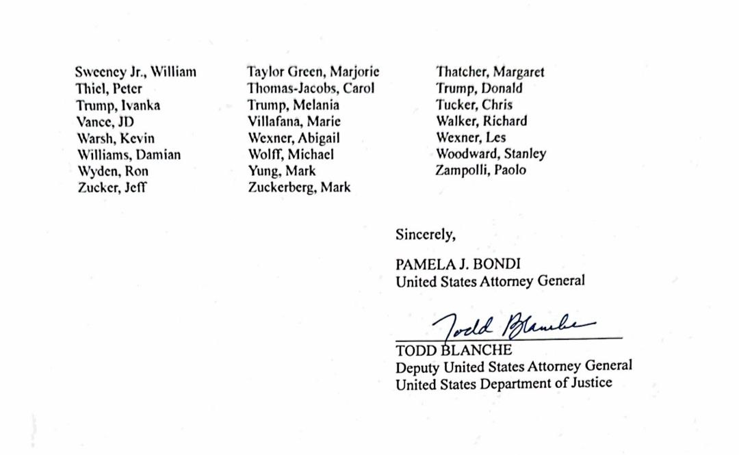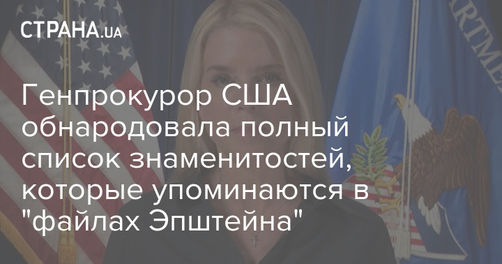 Генеральний прокурор США Пем Бонді опублікувала повний список знаменитостей, імена яких зустрічаються у файлах фінансиста та секс-злочинця Джеффрі Епштейна.