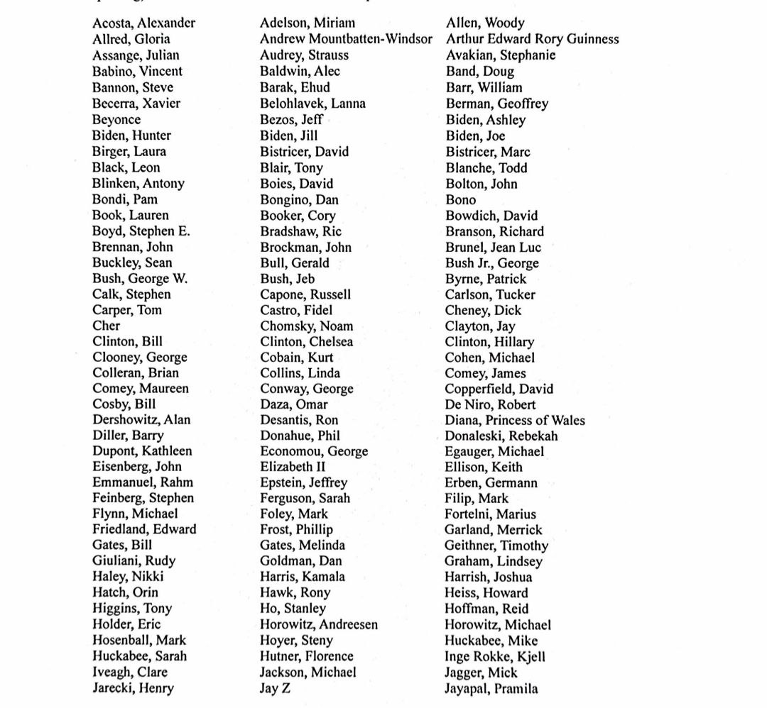 Серед фігурантів списку - Дональд Трамп, Барак та Мішель Обама, принц Гаррі, Білл Гейтс, Вуді Аллен, Кім Кардаш'ян, Курт Кобейн, Марк Цукерберг та Брюс Спрінгстін. У списку понад 300 осіб - це ті, хто були або є державними посадовими особами чи публічними персонами та чиї імена щонайменше один раз зустрічаються у матеріалах.