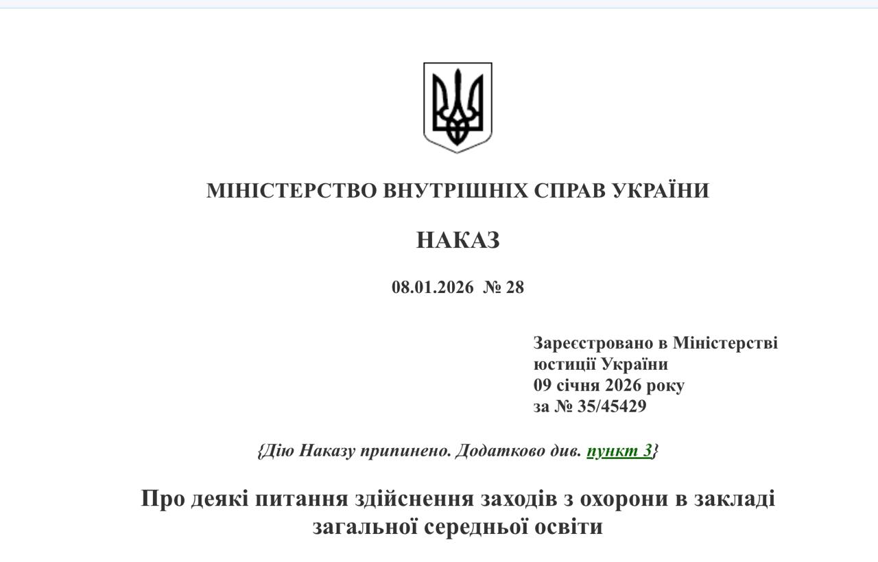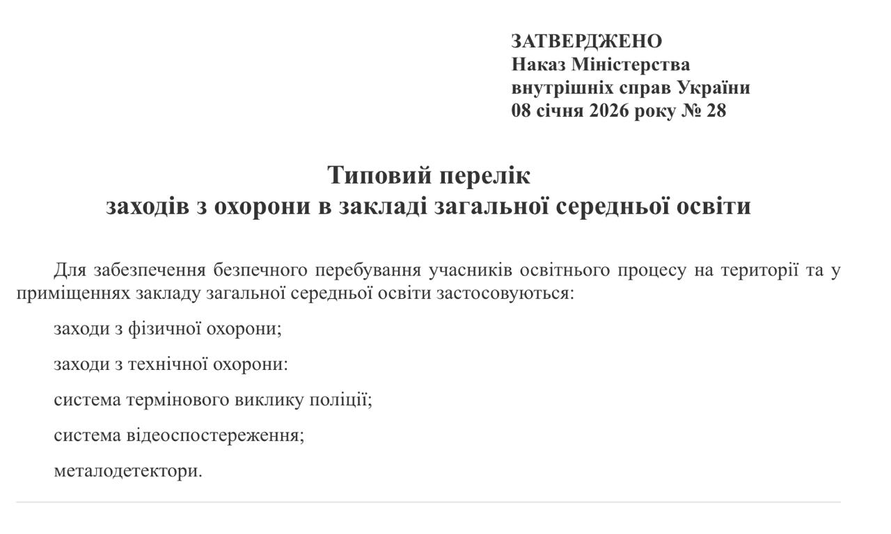 Міністерство внутрішніх справ оновило список заходів щодо охорони навчальних закладів на період військового стану. Згідно з документом, тепер у всіх школах мають бути встановлені металодетектори, системи відеоспостереження та термінового виклику поліції, а також бути охороною.