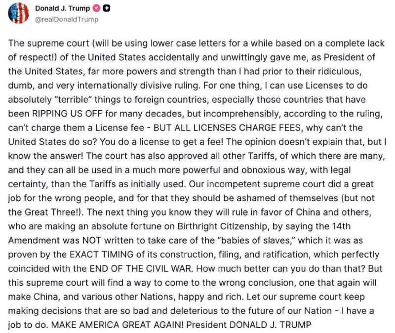 "Я можу використовувати ліцензії, щоб робити абсолютно жахливі речі щодо іноземних держав, особливо тих, які десятиліттями обдирали США, але, що незбагненно, згідно з цим рішенням не можу стягувати з них ліцензійний збір. Але ж всі ліцензії припускають оплату. Чому Сполучені Штати не можуть цього робити? Ліцензія оформляється, щоб стягувати плату! У рішенні це не пояснюється, але я знаю відповідь!» - йдеться у публікації президента США.
